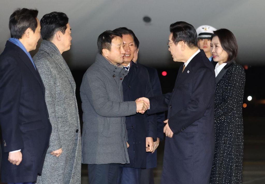 일본 방문 일정을 마치고 귀국한 이재명 대통령이 14일 성남 서울공항에서 더불어민주당 정청래 대표와 인사하고 있다. 연합뉴스