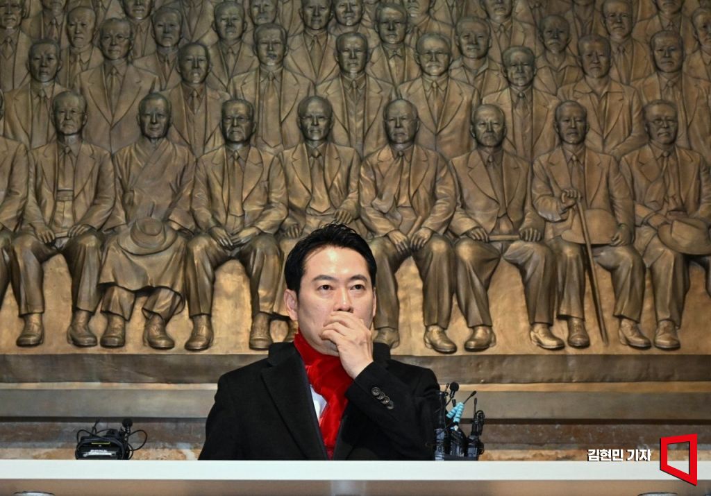 장동혁 국민의힘 대표가 15일 국회 로텐더홀 제헌국회의원상 앞에서 공천헌금·통일교 특검 수용을 촉구하며 단식에 돌입하고 있다.