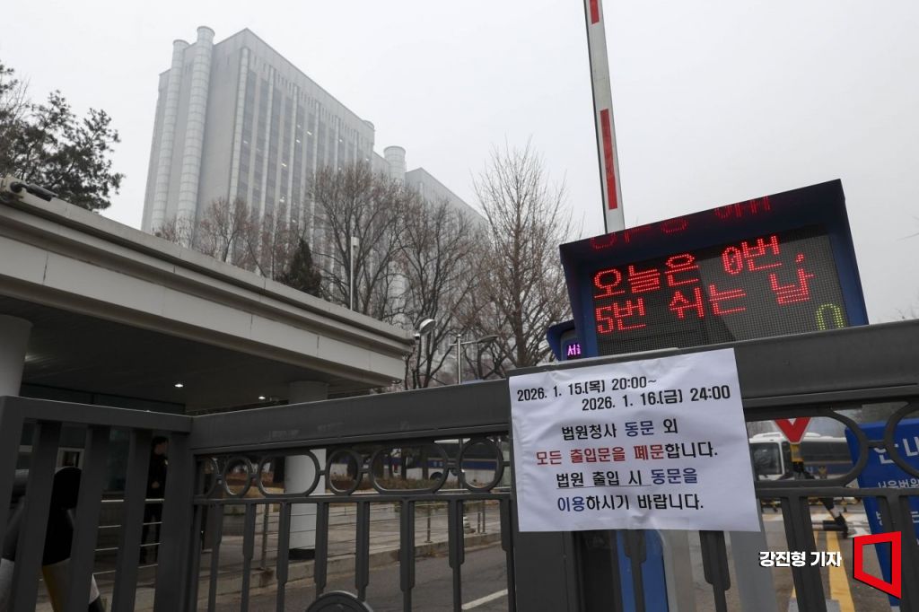윤석열 전 대통령의 특수공무집행방해 및 직권남용권리행사방해 등 혐의 사건 선고기일인 16일 서울 서초구 서울중앙지방법원 출입이 통제되고 있다.