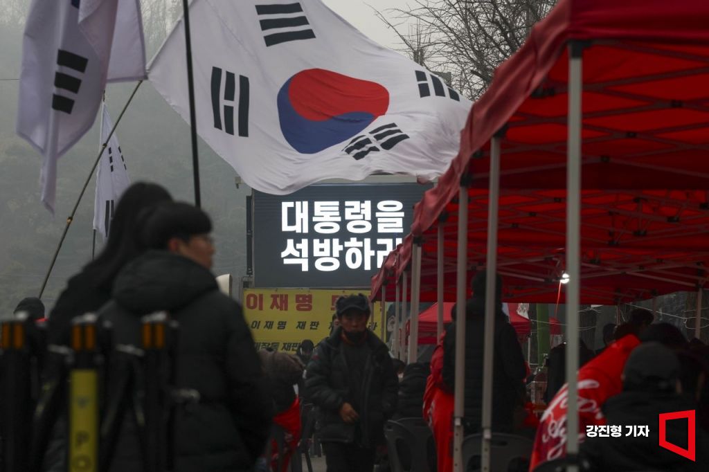윤석열 전 대통령의 특수공무집행방해 및 직권남용권리행사방해 등 혐의 사건 선고기일인 16일 서울 서초구 서울중앙지방법원 인근에서 윤 전 대통령 지지자들이 석방을 촉구하며 태극기를 흔들고 있다.