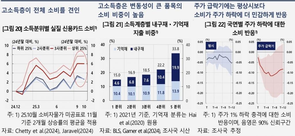 이런 경제력 양극화는 충격 발생 시 급격한 소비 부진을 초래할 수 있다는 점에서 주요한 잠재적 취약요인이라고 보고서는 짚었다. 특히 지난해 주가 상승에 따른 부의 효과가 소비를 0.4% 늘린 것으로 추정되는데, 이런 상황에서 급격한 주가 조정이 발생할 경우 고소득층의 늘어난 소비가 되돌려지며 소비 위축이 가속화될 가능성이 크다. 고소득층은 내구재, 기억재 등의 소비 비중이 높아 소비 변동성이 큰 편이다.