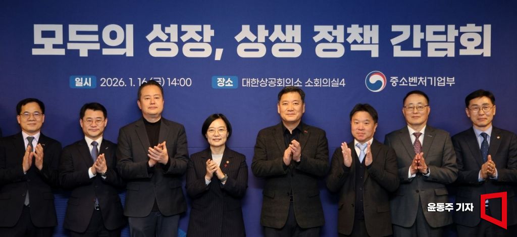 한성숙 중소벤처기업부 장관이 16일 서울 중구 대한상의에서 열린 '모두의 성장, 상생 정책 간담회'에 참석, 간담회 시작에 앞서 참석자들과 기념사진을 찍고 있다. 이번 간담회는 정부가 새해 경제 성장전략에서 제시한 '모두의 성장' 기조에 맞춰 준비 중인 '대·중소기업 상생 성장전략'에 대한 현장의 의견을 듣기 위해 마련됐다.