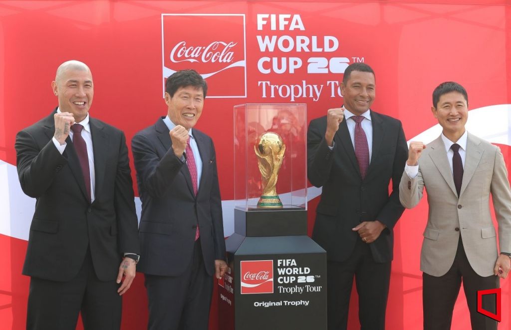 FIFA 전설적 인물인 전 브라질 축구 국가대표 선수 지우베르투 시우바가 16일 서울 김포 비즈니스 항공센터에서 열린 'FIFA 월드컵™ 트로피 투어 by 코카-콜라' 행사에 방한해 기념촬영 하고 있다. 왼쪽부터 차두리 감독, 차범근 전 감독, 지우베르투 시우바 전 브라질 축구 국가대표 선수, 이영표 해설위원. 공항사진기자단