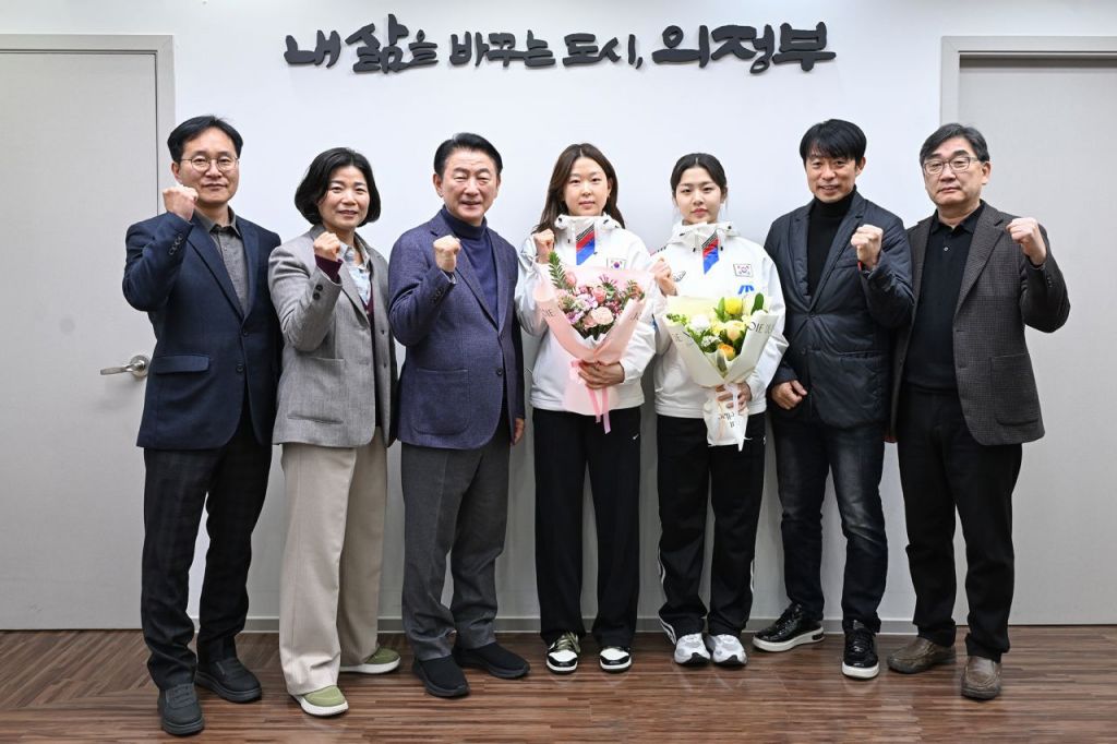 김동근 의정부시장이 16일 밀라노-코르티나 동계올림픽에 출전하는 김민선 선수와 정희단 선수를 격려한 후 기념촬영을 하고 있다. 의정부시 제공