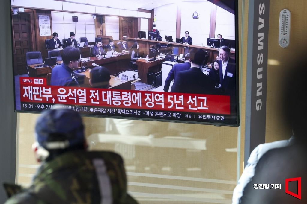 재판부가 윤석열 전 대통령에게 체포 방해와 국무위원 심의권 침해 등 혐의에 대해 1심 징역 5년을 선고한 16일 서울역 대합실에서 시민들이 생중계 재판을 보고 있다.