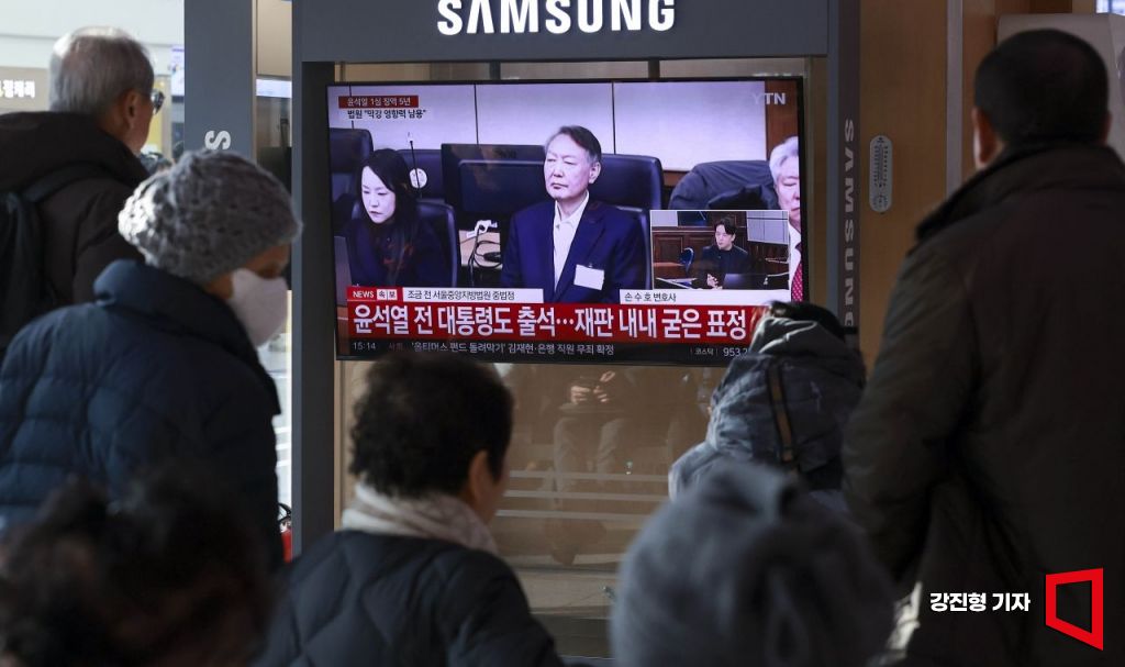 재판부가 윤석열 전 대통령에게 체포 방해와 국무위원 심의권 침해 등 혐의에 대해 1심 징역 5년을 선고한 16일 서울역 대합실에서 시민들이 재판을 보고 있다.