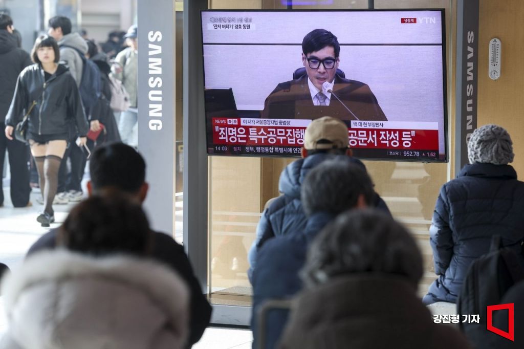 재판부가 윤석열 전 대통령에게 체포 방해와 국무위원 심의권 침해 등 혐의에 대해 1심 징역 5년을 선고한 16일 서울역 대합실에서 시민들이 생중계 재판을 보고 있다.