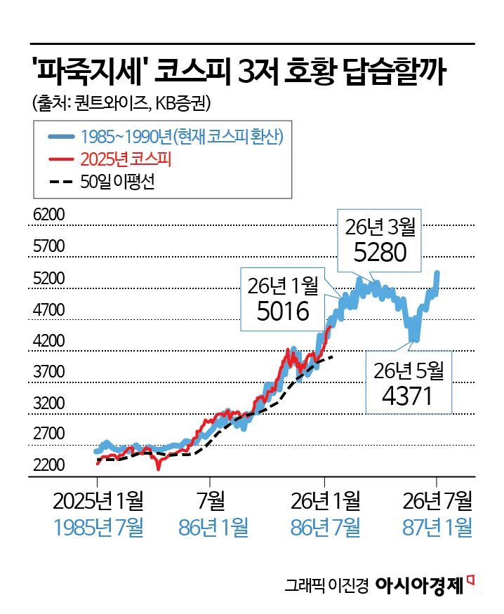 일각에선 현재 코스피 흐름이 1980년대 후반 '3저 호황' 당시와 유사하다는 분석도 나온다. 이은택 KB증권 연구원은 "앞으로도 유사한 흐름이 이어진다면 코스피 5000은 1월 말이면 도달이 가능하다"며 "다만 당시 주가 패턴을 그대로 답습한다면 2분기엔 급락이 나타날 수도 있다"고 말했다. 당시 코스피는 미 연방준비제도(Fed)가 1986년 8월을 마지막으로 금리 인하 사이클의 종료를 선언하면서 같은 해 10월까지 -17.6%에 이르는 조정을 겪은 바 있다.
