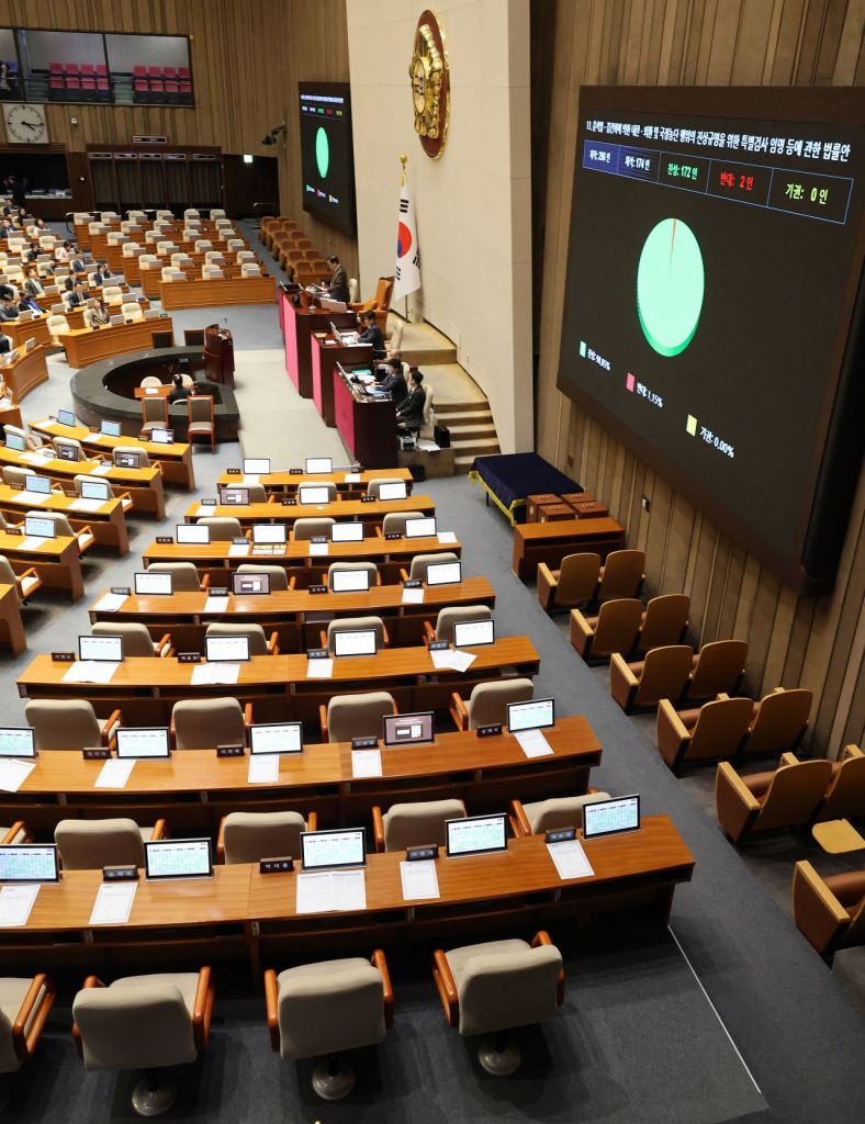 국회는 이날 오후 본회의를 열고 재석 174명 가운데 찬성 172표, 반대 2표로 2차 종합특검법을 가결시켰다. 국민의힘 의원들은 표결에 불참했다.