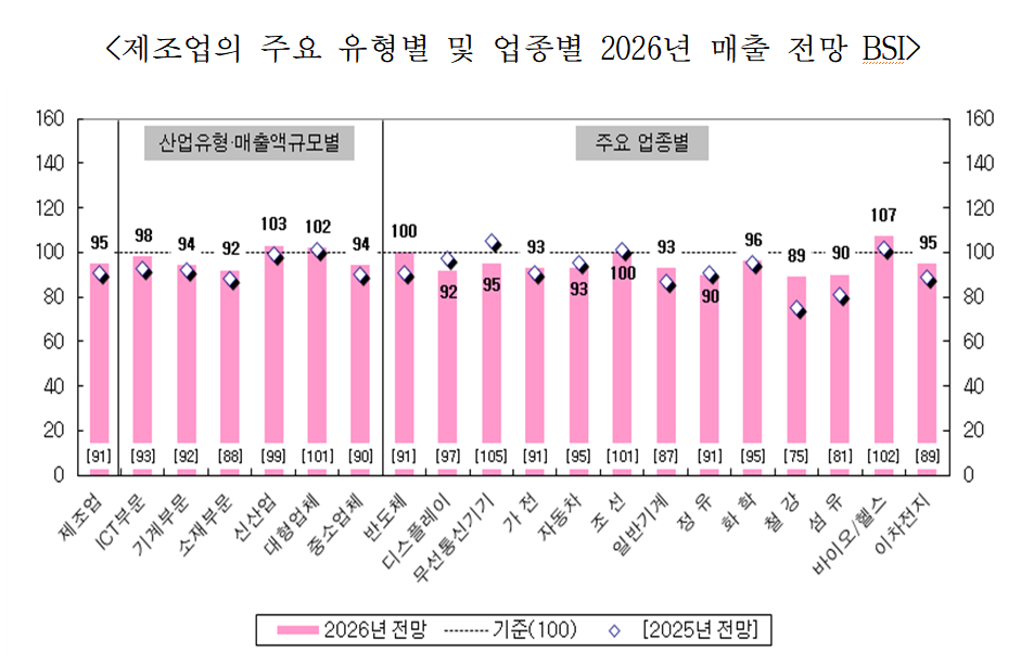 올해 연간 제조업 매출 전망 BSI는 95로 기준선 아래였으나, 지난해(91) 대비 4포인트 개선된 것으로 나타났다. 업종별로 바이오헬스는 107로 매출 증가가 예상됐고, 반도체와 조선은 각각 100으로 기준선에 걸쳤다. 산업 유형·매출 규모별로는 신산업(103)과 대형업체(102)의 매출 전망이 밝았다.