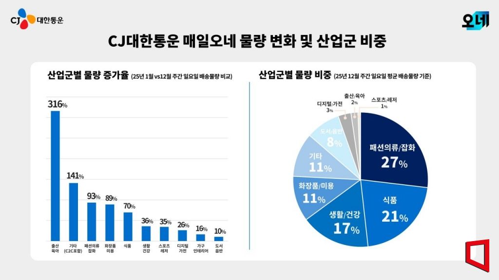 CJ대한통운이 지난해 데이터를 분석한 결과, 12월 일요일 배송 물량이 연초 대비 67% 증가했다. 상품 종류별로 생활소비재를 중심으로 물량이 크게 확대됐다. 출산·육아상품 배송물량은 316% 폭증하며 가장 높은 증가율을 기록했다. 기저귀와 분유, 유아용품 등 갑작스러운 구매 빈도가 높은 카테고리 특성상 '매일오네' 효과가 크게 발현된 것으로 분석됐다.