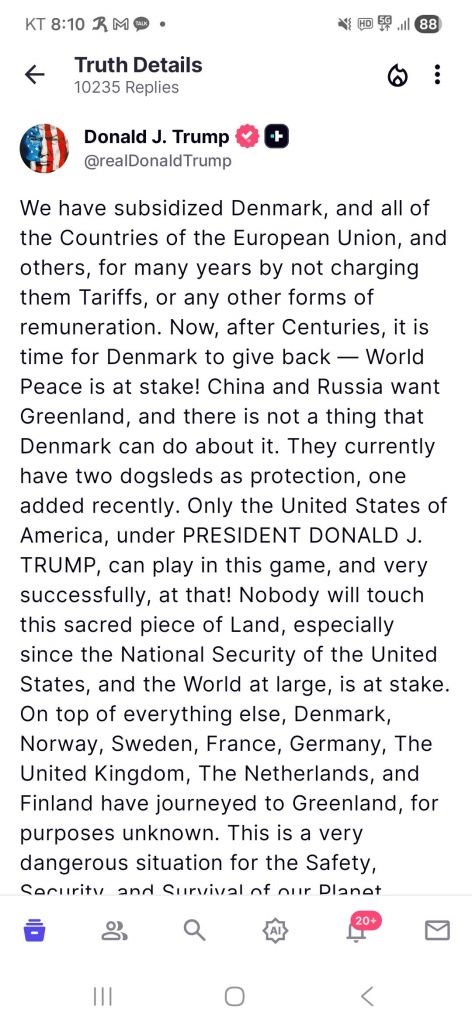 트럼프 대통령이 그린란드 병합 야욕을 지속해서 드러내자, 지난 15일 덴마크·노르웨이·스웨덴·프랑스·독일·영국·네덜란드·핀란드 등 8개국은 그린란드에 정찰병 등 소규모 병력을 파병하기로 결정했다. 이에 트럼프 대통령은 지난 17일 트루스소셜을 통해 "2월1일부터 위에 언급된 모든 국가가 미국으로 수출하는 모든 상품에 대해 10%의 관세를 부과할 것"이라며 "6월1일부터는 관세를 25%로 인상하고, 미국이 그린란드를 완전히 매입하는 합의가 성사될 때까지 (관세를) 부과할 것"이라고 적었다.