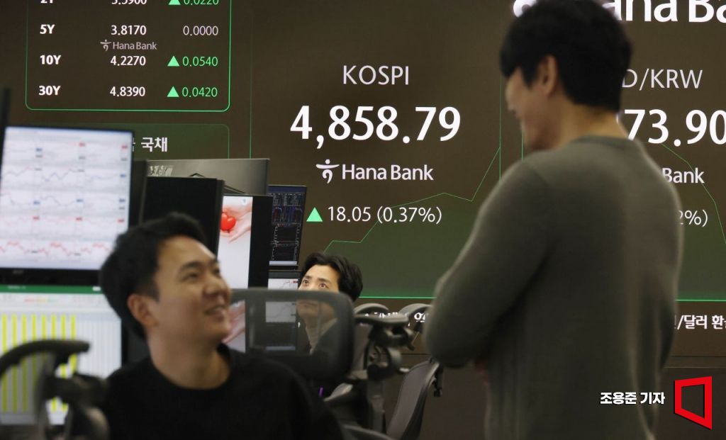코스피가 꿈의 지수로 불리는 '오천피'(코스피 5,000) 돌파를 위한 상승세를 이어가고 있는 가운데 장중 사상 최고치인 4,858.79를 찍은 19일 서울 중구 하나은행 본점 딜링룸에서 직원이 증시와 환율 등을 모니터하고 있다. 이날 코스피는 11.34포인트(0.23%) 내린 4829.40 시작했다.