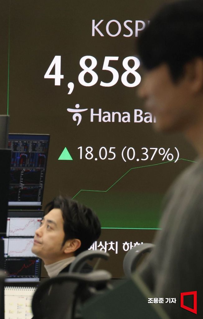 코스피가 꿈의 지수로 불리는 '오천피'(코스피 5,000) 돌파를 위한 상승세를 이어가고 있는 가운데 장중 사상 최고치인 4,858.79를 찍은 19일 서울 중구 하나은행 본점 딜링룸에서 직원이 증시와 환율 등을 모니터하고 있다. 이날 코스피는 11.34포인트(0.23%) 내린 4829.40 시작했다.