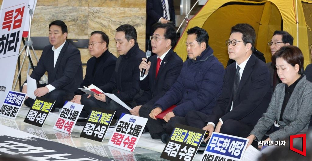 송언석 국민의힘 원내대표가 19일 국회 로텐더홀 농성장에서 열린 최고위원회의에서 발언하고 있다.