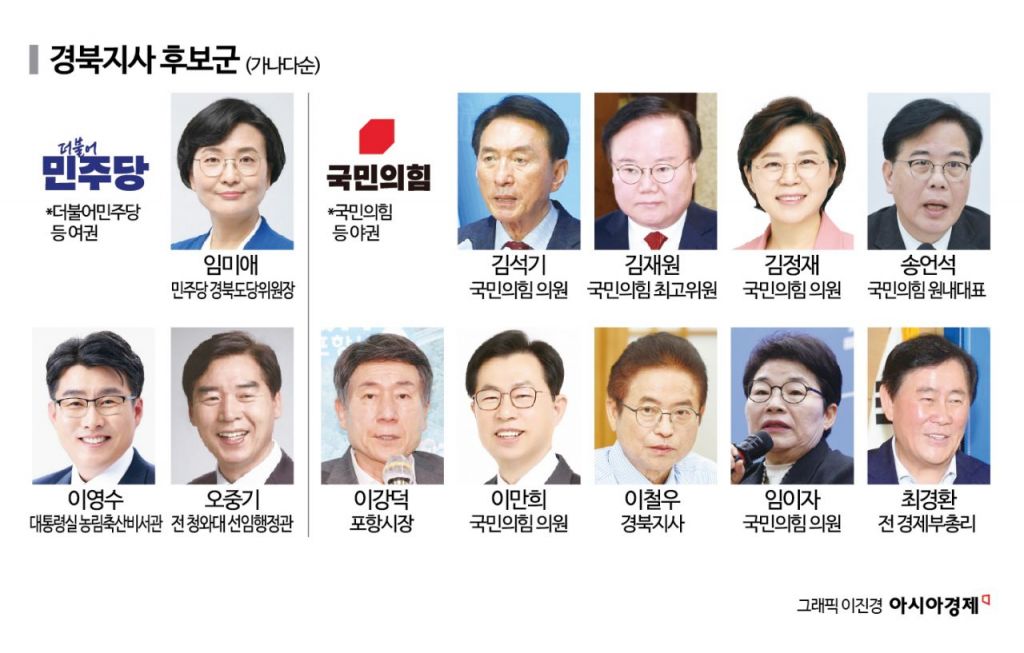 국민의힘은 이 지사가 3선 도전을 공식화했다. 이강덕 경북 포항시장도 출마를 선언했다. 최경환 전 경제부총리와 경북 3선 의원 출신인 김재원 최고위원도 출마 의사를 굳혔다. 현역 의원 중에선 김석기·김정재·송언석·이만희·임이자 의원 등이 후보로 언급된다.