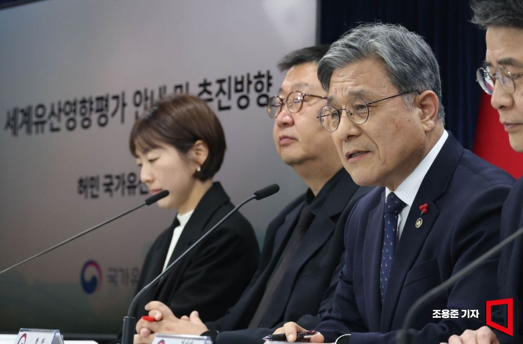 허민 국가유산청장이 19일 서울 종로구 정부서울청사에서 열린 세계유산영향평가 언론 설명회에서 모두 발언하고 있다.
