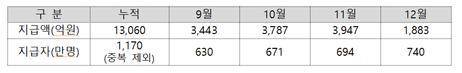 지난해 9월15일부터 12월31일까지 상생페이백 접수엔 총 1564만명이 몰렸다. 이 중 9월 630만명(3443억원), 10월 671만명(3787억원), 11월 694만명(3947억원), 12월 740만명(1883억원)이 조건을 충족해 지급받았다. 신청 기간 누적 지급액은 총 1조 3060억원이며, 1인당 평균 지급액은 약 11만원 선이다.