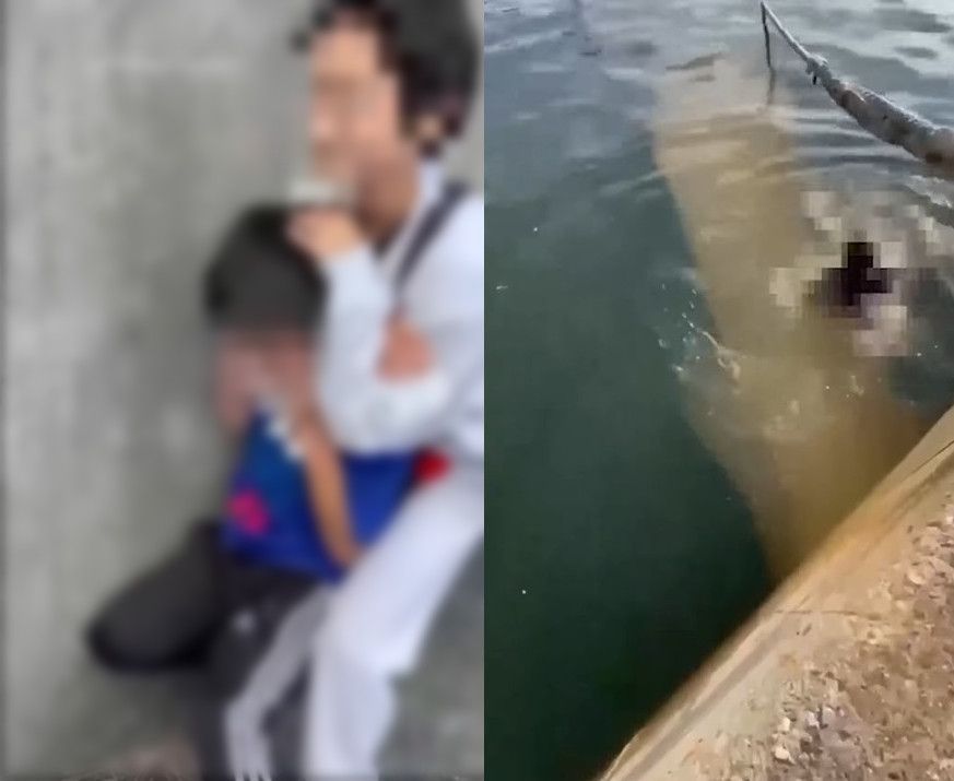 가해 학생이 피해 학생의 목을 조르는 모습과 이로 인해 피해 학생으로 추정되는 인물이 바닷물에 빠진 모습. 엑스(X)