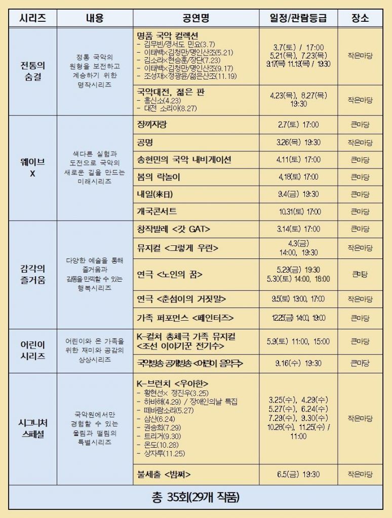 5개 시리즈는 정통 국악의 원형을 보존하고 멋을 소개하는 '전통의 숨결', 색다른 실험으로 국악의 새로운 길을 제시하는 '웨이브 X', 다양한 예술로 즐거움과 감동을 만끽하는 '감각의 즐거움', 어린이와 가족을 위한 재미와 공감의 '어린이 시리즈', 국악원에서만 경험할 수 있는 '시그니처 스페셜' 등이다.