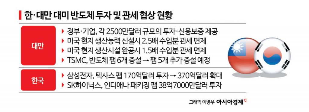 대만 기업은 미국 내 생산 능력을 건설 단계 기준 2.5배, 완공 이후 1.5배 확대할 경우 관세 감면을 받을 수 있다. 미국이 개별 국가 합의를 언급하긴 했지만, 대만 반도체 업계가 미국 투자를 안보·공급망 관점에서 수용하면서 미국이 유사한 모델을 한국과 일본, 유럽으로 확장할 명분을 얻게 됐다는 분석도 제기된다.
