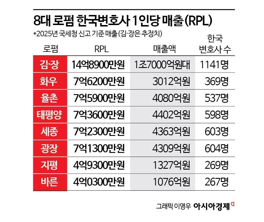 대형 로펌들의 지난해 실적이 공개되면서 '한국변호사 1인당 매출액(RPL)' 경쟁도 본격화되는 분위기다. 대형 딜과 규제 대응, 분쟁이 맞물리는 사건이 늘면서 로펌의 인력 운용과 업무 포트폴리오가 실적 지표에 그대로 반영되기 때문이다. RPL은 연 매출을 한국변호사 수로 나눈 값으로, 변호사 1명이 1년 동안 만들어낸 매출을 뜻한다. 같은 매출이라도 인력 규모와 수임 구조에 따라 수치가 달라져 생산성을 가늠하는 지표로 활용된다.