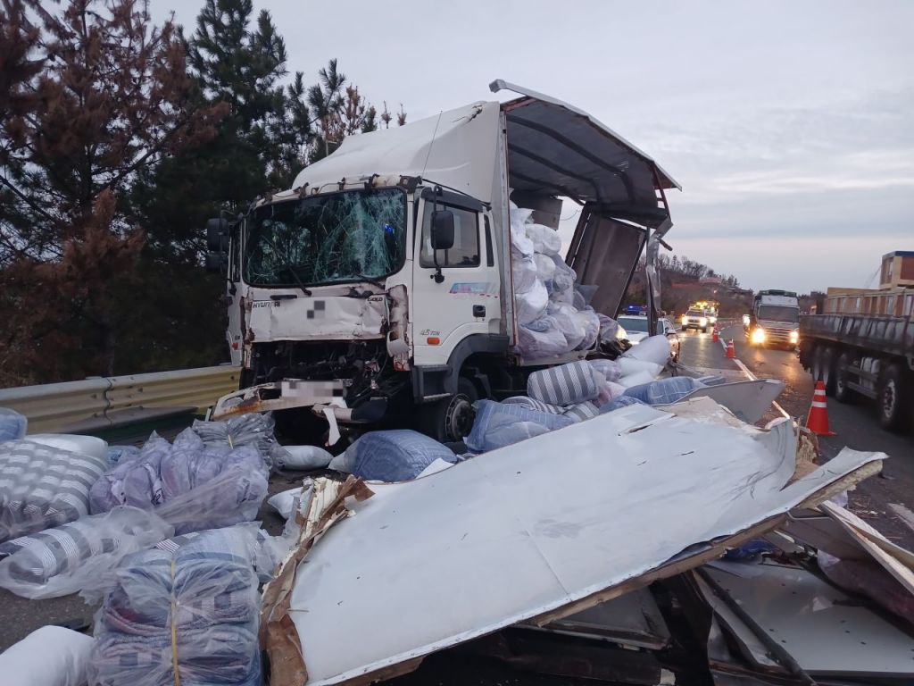 1차 사고를 낸 4.5톤 화물차가 파손되며 적재함에 실려있던 침구류가 도로에 쏟아지기도 했다.