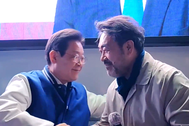 제22대 총선을 앞둔 2024년 4월1일 당시 인천 계양을 후보였던 이재명 대통령이 자신의 선거 유세 현장에서 지지 연설을 한 배우 이원종에게 감사 인사를 하고 있다. 유튜브 채널 ‘이재명’