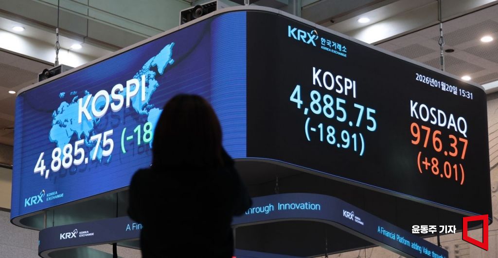 20일 오천피를 앞두고 코스피 지수가 13거래일만에 하락하며 전 거래일 대비 0.39% 내린 4,885.75으로장을 마감했다. 2026.01.20 윤동주 기자