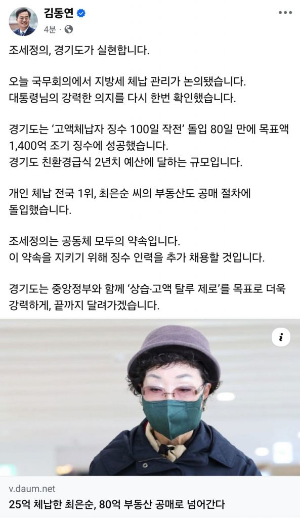 특히 "(징수액은) 경기도 친환경 급식 2년치 예산에 달하는 규모"라며 "개인 체납 전국 1위, 최은순 씨의 부동산도 공매 절차에 돌입했다"고 덧붙였다.