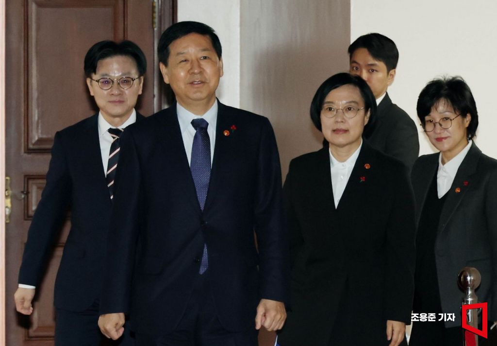 구윤철 경제부총리 겸 재정경제부 장관(가운데)을 비롯해 김정관 산업통상부 장관(왼쪽), 한성숙 중소벤처기업부 장관(오른쪽 두번째), 원민경 성평등가족부 장관(오른쪽) 등이 21일 서울 종로구 정부서울청사에서 열린 경제관계장관회의에 참석하고 있다.