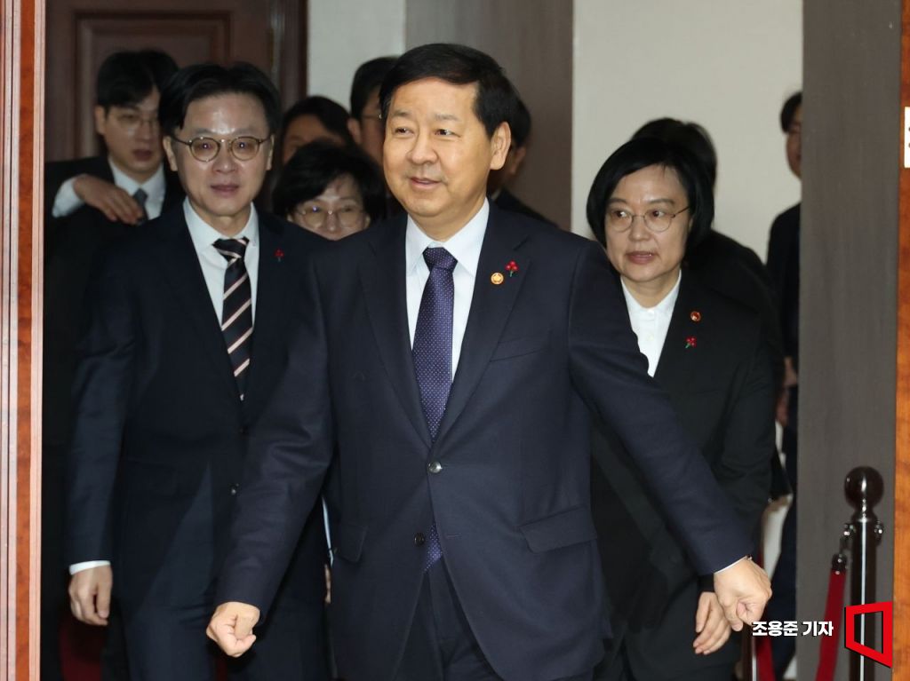 구윤철 경제부총리 겸 재정경제부 장관(가운데)을 비롯해 김정관 산업통상부 장관(왼쪽), 한성숙 중소벤처기업부 장관 등이 21일 서울 종로구 정부서울청사에서 열린 경제관계장관회의에 참석하고 있다.