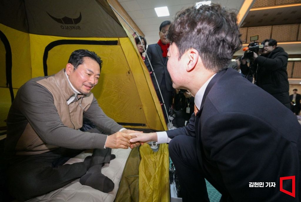 이준석 개혁신당 대표가 21일 해외 출장에서 조기 귀국해 단식 중인 장동혁 국민의힘 대표를 만났다. 양당은 통일교·더불어민주당 공천 뇌물 의혹에 대한 쌍특검 수용 촉구를 위해 공조를 강화할 방침이다.
