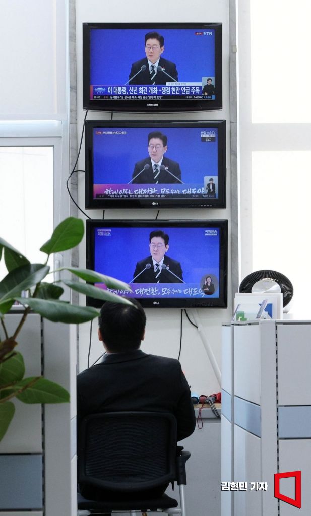21일 국회 국민의힘 원내대표실에 설치된 화면에 이재명 대통령 신년 기자회견 생중게 화면이 나오고 있다.