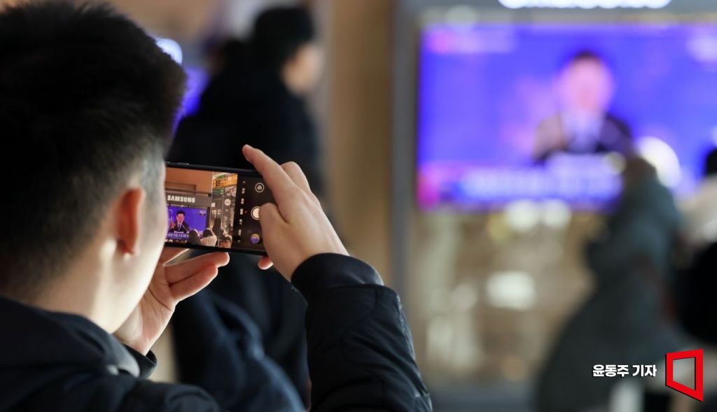 21일 서울 용산구 서울역 대합실에서 시민들이 이재명 대통령 신년 기자회견 방송을 지켜보는 도중 핸드폰으로 사진을 찍고 있다.