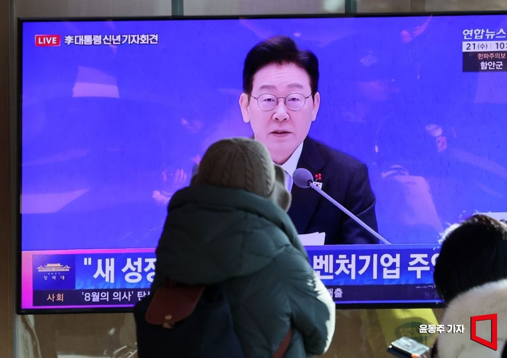 21일 서울 용산구 서울역 대합실에서 시민들이 이재명 대통령 신년 기자회견 방송을 지켜보고 있다.