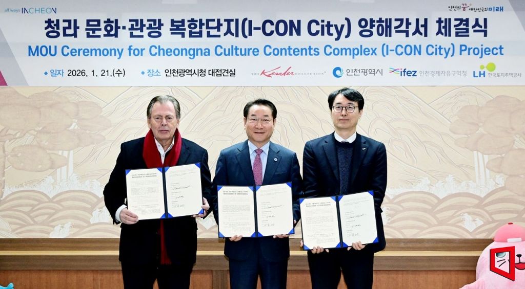 인천경제자유구역청은 21일 인천시청에서 미국 유명 호텔 체인 케슬러 컬렉션, 한국토지주택공사(LH)와 청라 아이콘 시티 프로젝트 추진을 위한 양해각서를 체결했다.