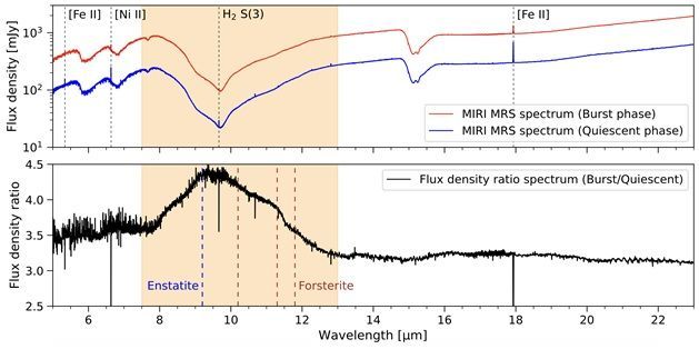 그 결과 폭발기에서만 결정질 규산염의 특징적인 적외선 신호가 뚜렷하게 검출됐다. 분석 결과 이는 결정질 감람석과 휘석 성분으로, 태아별에 가까운 뜨거운 원반 안쪽에서 새롭게 형성된 물질임이 확인됐다. 이는 규산염 결정화가 별 탄생 초기의 폭발적 진화 단계에서 실제로 일어남을 보여주는 직접적인 관측 증거다.