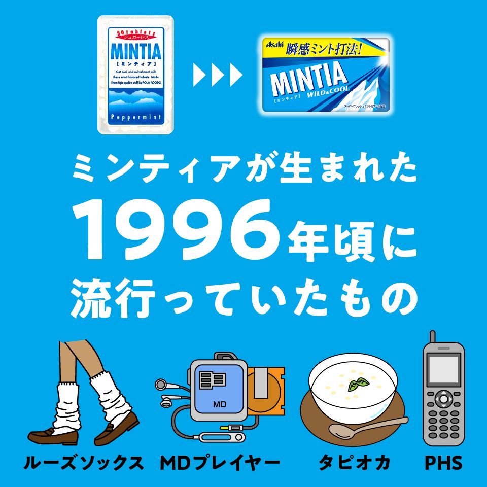 1996년 발매 당시 세로형 케이스에 담겨 나왔던 민티아. 이후 지금의 가로형으로 바뀌게 됐다. 민티아가 발매될 즈음에는 루즈삭스, 미니디스크 플레이어 등이 유행했다. 아사히식품.