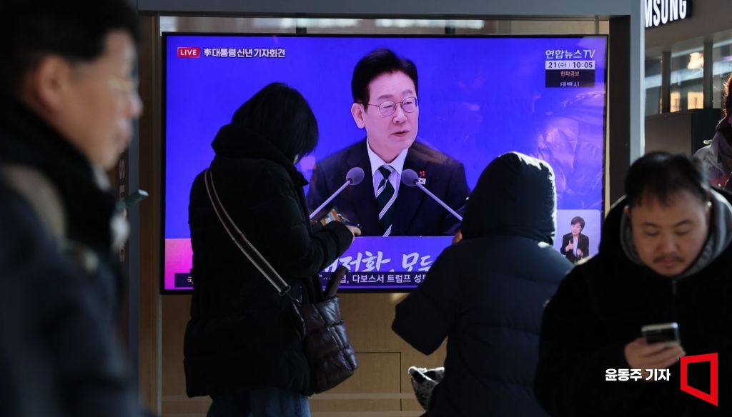 21일 서울 용산구 서울역 대합실에서 시민들이 이재명 대통령 신년 기자회견 방송을 지켜보고 있다. 2026.01.21 윤동주 기자
