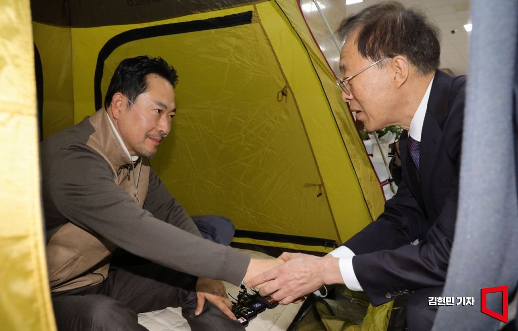 통일교·공천헌금 '쌍특검' 수용을 요구하며 단식 중인 국민의힘 장동혁 대표가 21일 국회 로텐더홀 단식 농성장을 찾은 이석연 국민통합위원장과 인사하고 있다.