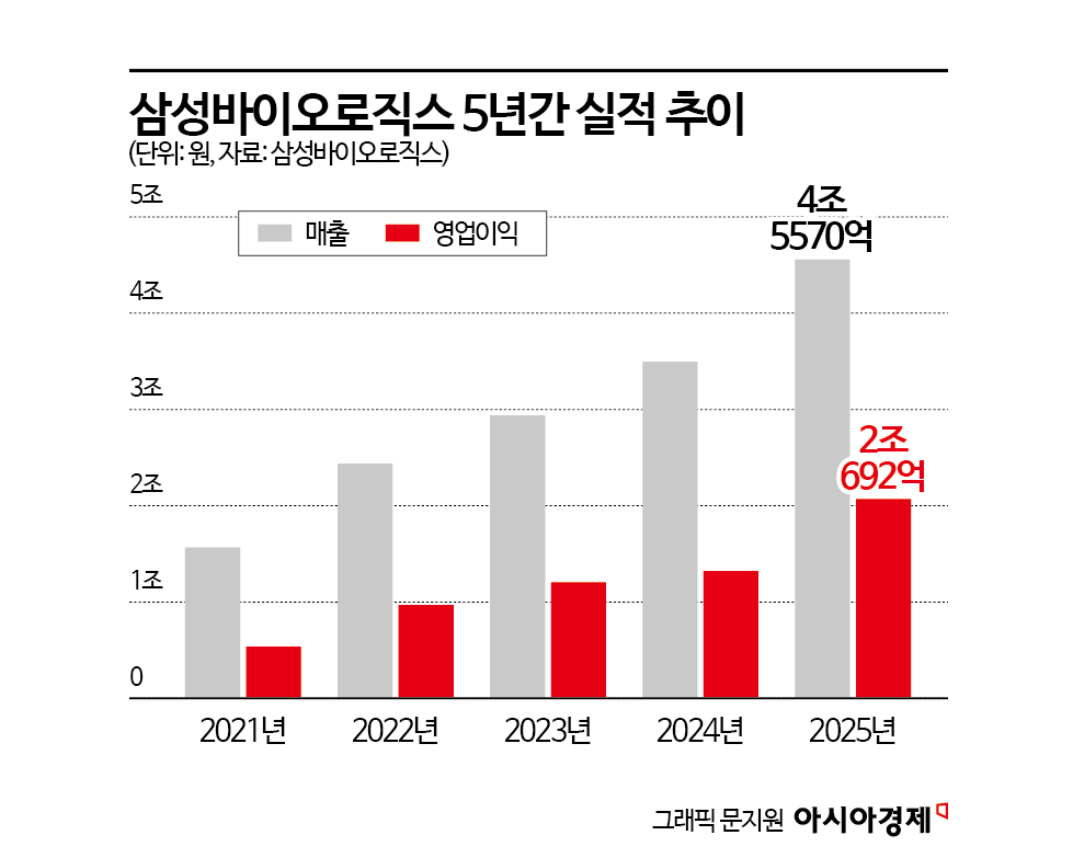 이번 실적에서 시장이 주목하는 대목은 '영업이익 2조 시대'의 상징성이다. 삼성바이오로직스는 2011년 설립 이후 설비 확장에 속도를 내며 성장했고, 2023년 영업이익 1조원을 돌파한 뒤 2024년 1조3201억원을 기록했다. 그다음 해인 지난해 곧바로 2조원을 넘어선 것이다. 설립 이후 조 단위 영업이익을 내기까지 걸린 시간도 짧았지만, 1조원에서 2조원으로 넘어가는 속도가 더 빨랐다.