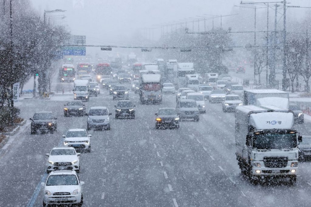 광주·전남 일부 지역에 대설주의보가 내려진 지난 21일 오전 광주 서구 무진대로에서 차량들이 눈 속에서 서행하고 있다. 연합뉴스