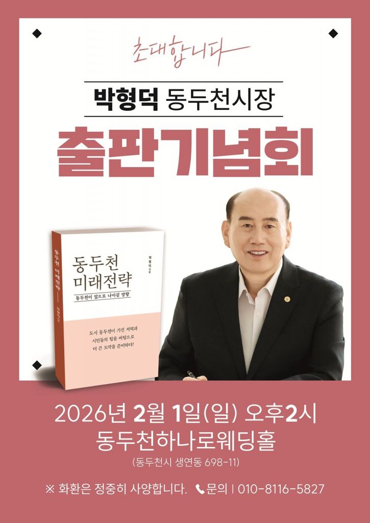 박형덕 동두천시장의 시정 운영 기록과 도시의 미래 비전을 담은 책 '동두천 미래전략'의 출판기념회가 오는 2월 1일 오후 2시, 동두천시 생연동에 위치한 동두천하나로웨딩홀에서 열린다.