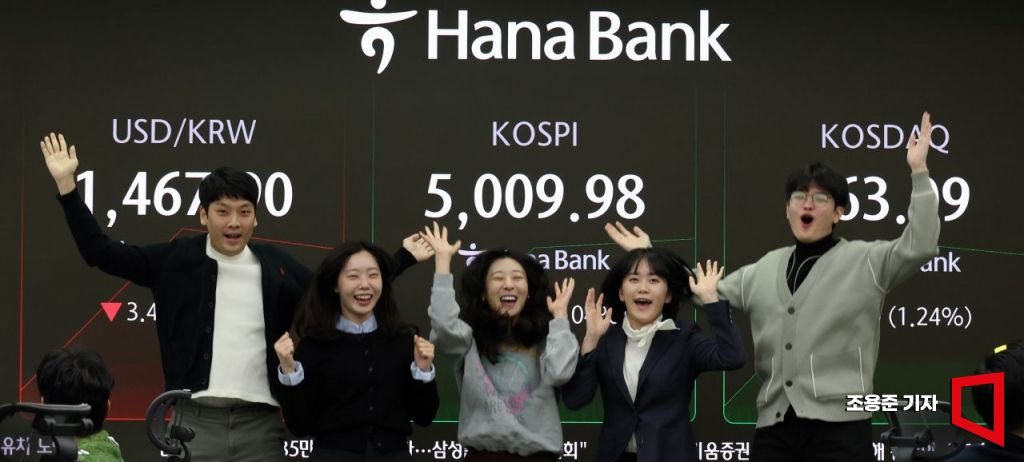 코스피가 꿈의 지수 '5000'을 돌파한 22일 서울 중구 하나은행 딜링룸에서 직원들이 기뻐하고 있다.