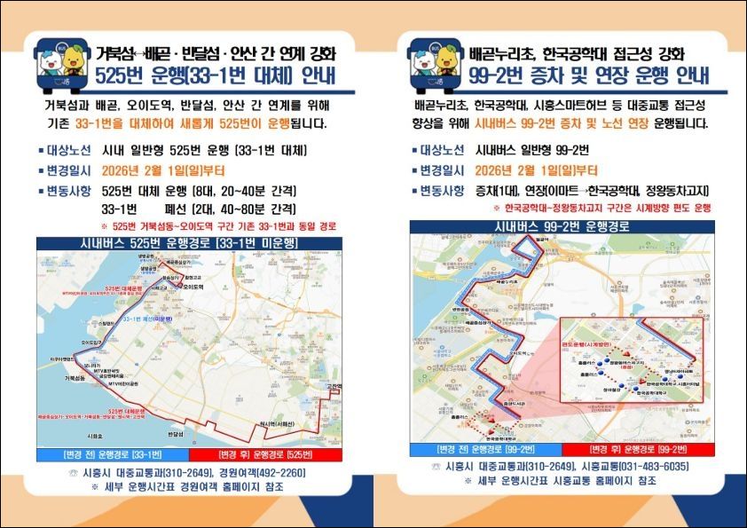 시는 배곧과 정왕동 일원의 접근성 강화를 위해 시내버스 일반형 99-2번 노선도 다음달 1일부터 증차·연장 운행한다. 이에 따라 이 노선에는 차량 1대가 추가로 투입되며, 한국공학대와 정왕동 차고지까지 운행 구간이 연장된다.