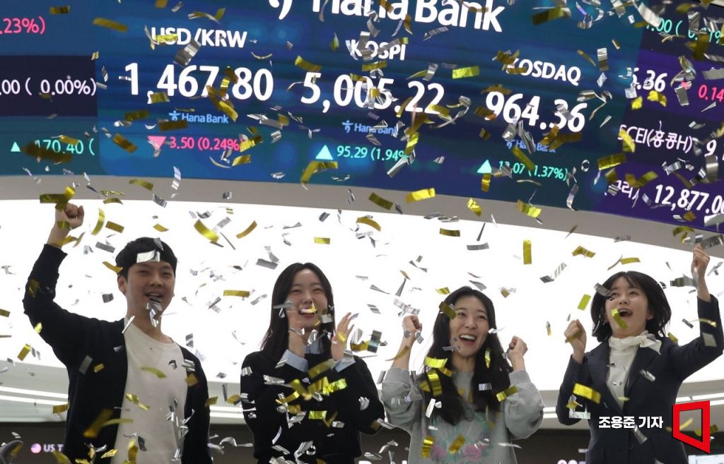 코스피가 꿈의 지수 '5000'을 돌파한 22일 서울 중구 하나은행 딜링룸에서 직원들이 기뻐하며 박수를 치고 있다. 2026.1.22 조용준 기자