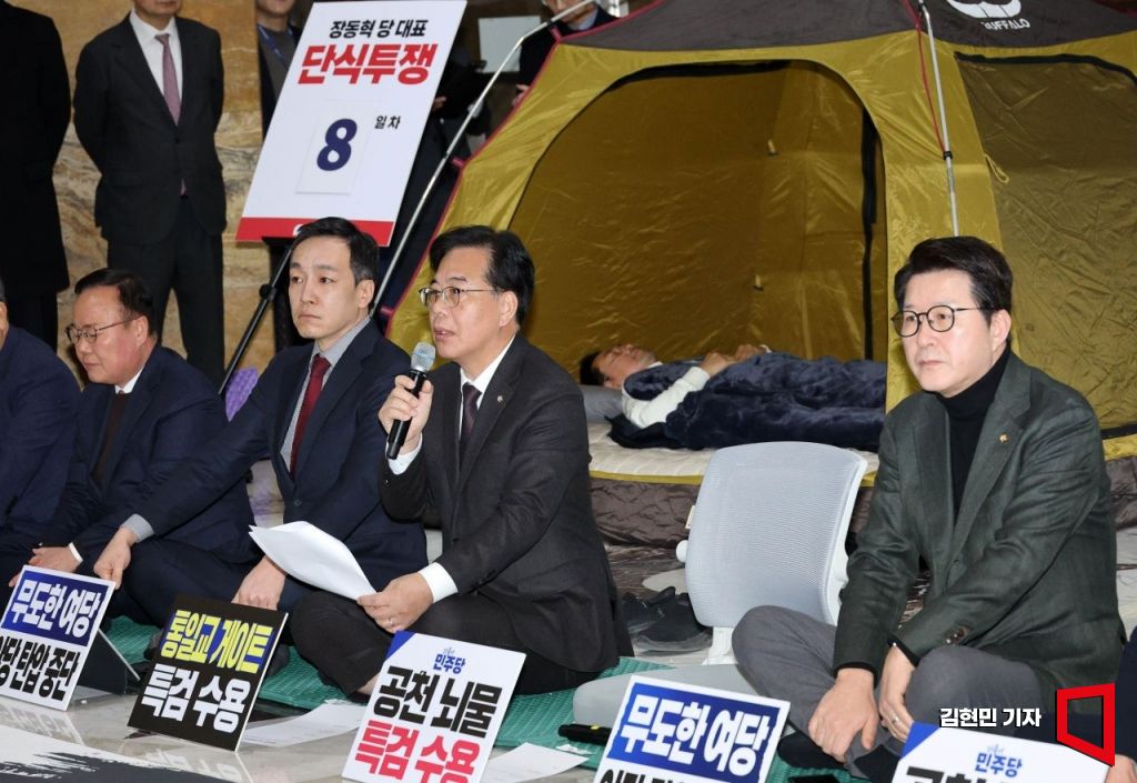 송언석 국민의힘 원내대표가 22일 장동혁 대표가 통일교·공천헌금 '쌍특검' 수용을 요구하며 여드레째 단식 농성을 벌이고 있는 국회 로텐더홀에서 열린 최고위원회의에서 발언하고 있다.