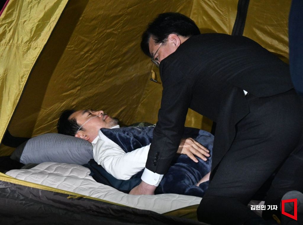 송언석 국민의힘 원내대표가 22일 국회 로텐더홀에서 통일교·공천헌금 '쌍특검' 수용을 요구하며 여드레째 단식 중인 장동혁 대표를 살펴보고 있다.