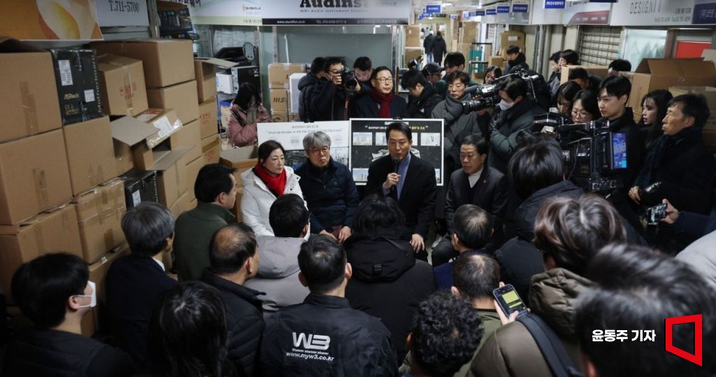 오세훈 서울시장이 22일 서울 용산구 선인상가에서 지역주민, 상인 등과 간담회를 갖고 있다.